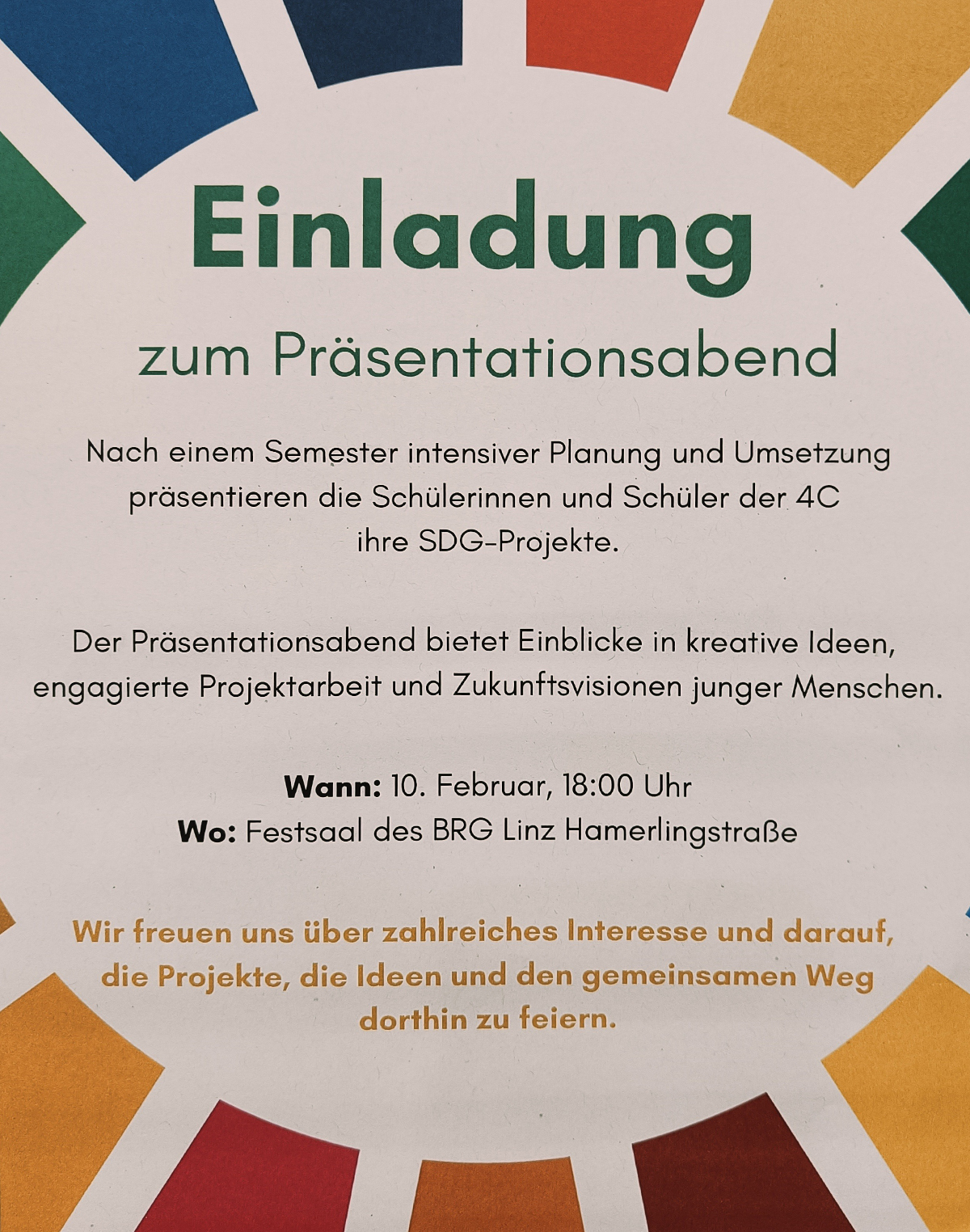 Im Rahmen eines gelungenen Präsentationsabends stellte die Klasse 4.C des BRG Linz Hamerling ihre Projekte zur Umsetzung der Sustainable Development Goals (SDGs) in Österreich vor. Über das gesamte Semester hinweg arbeiteten die Schülerinnen und Schüler intensiv an ihren Vorhaben. Eigenständige Planung, engagierte Teamarbeit und ein kreativer, kooperativer Prozess prägten die Projektphase.